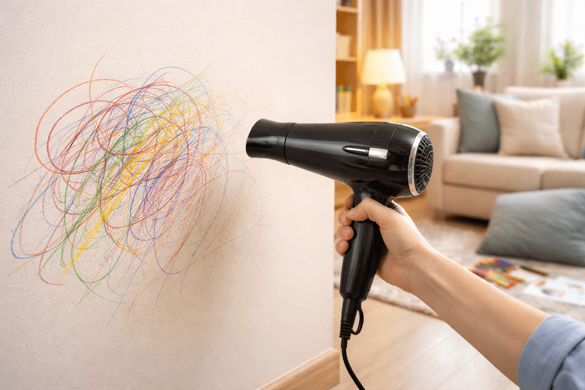 Toplota pomaže u omekšavanju voska iz bojica kojim su se mališani igrali. Nanesite mlaki vazduh na mrlju, a zatim očistite vlažnom krpom i neutralnim sapunom. Izbegavajte previsoke temperature kako ne biste oštetili farbu na zidu.